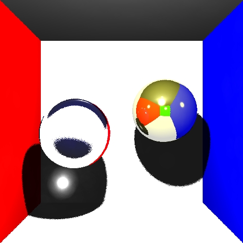 This image was anti-aliased, but as you can see, there are still aliasing issues. I'm not sure yet if those are color-bleeding effects or not. I am using a slightly older implementation of my ray tracer.